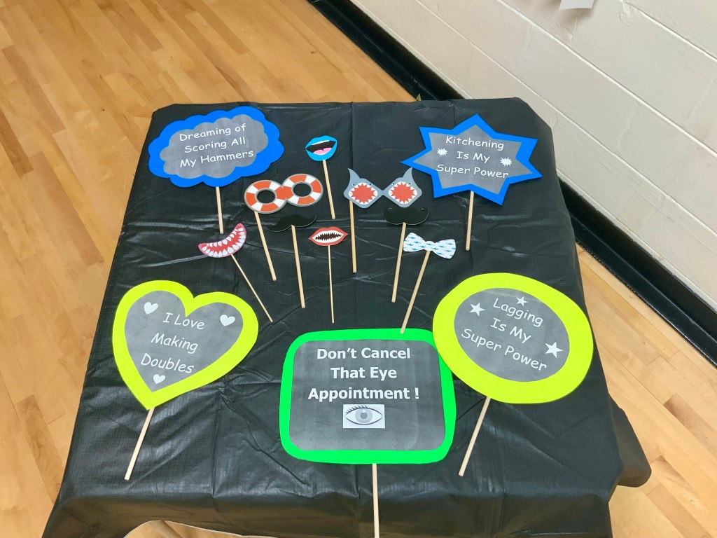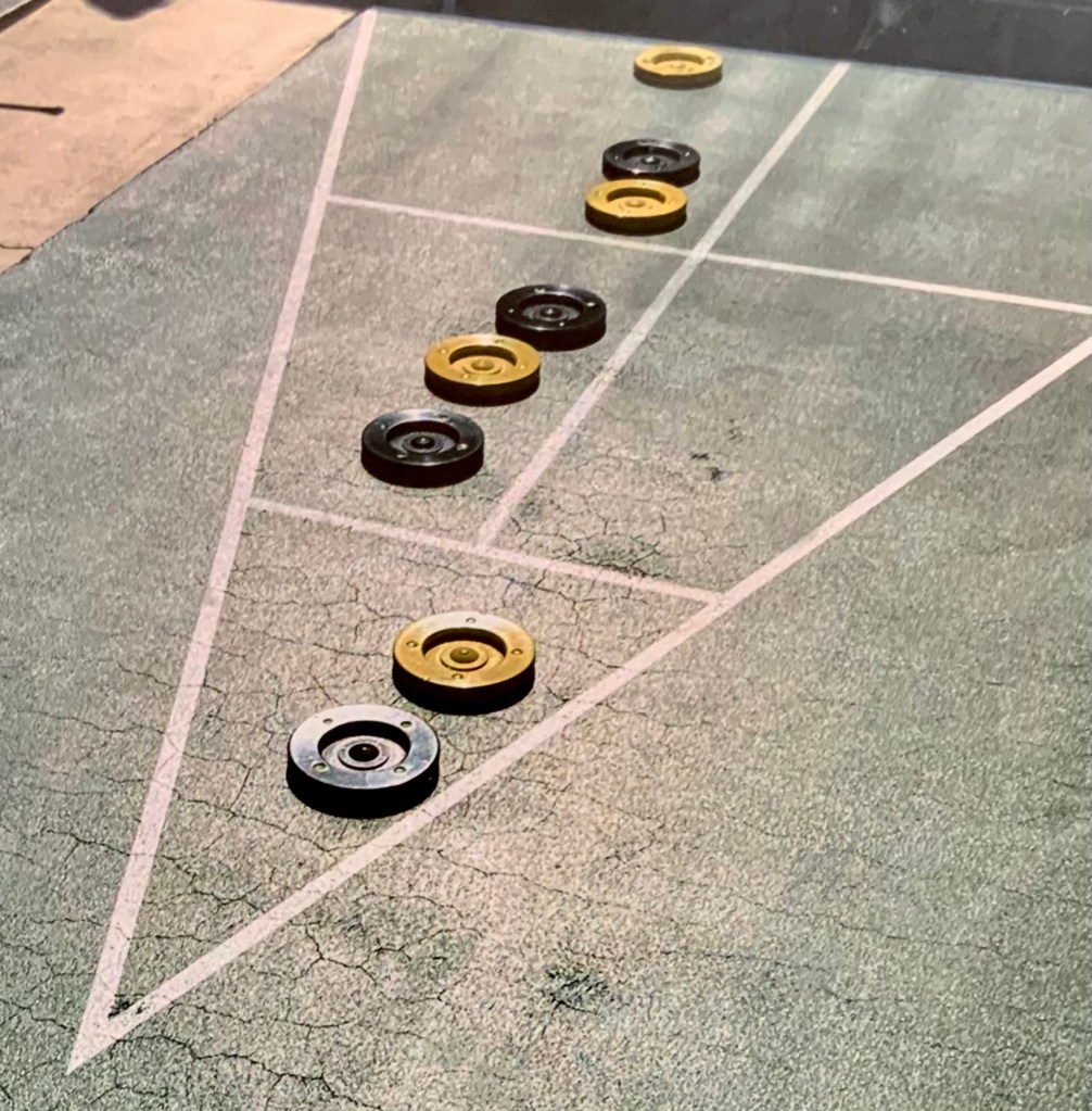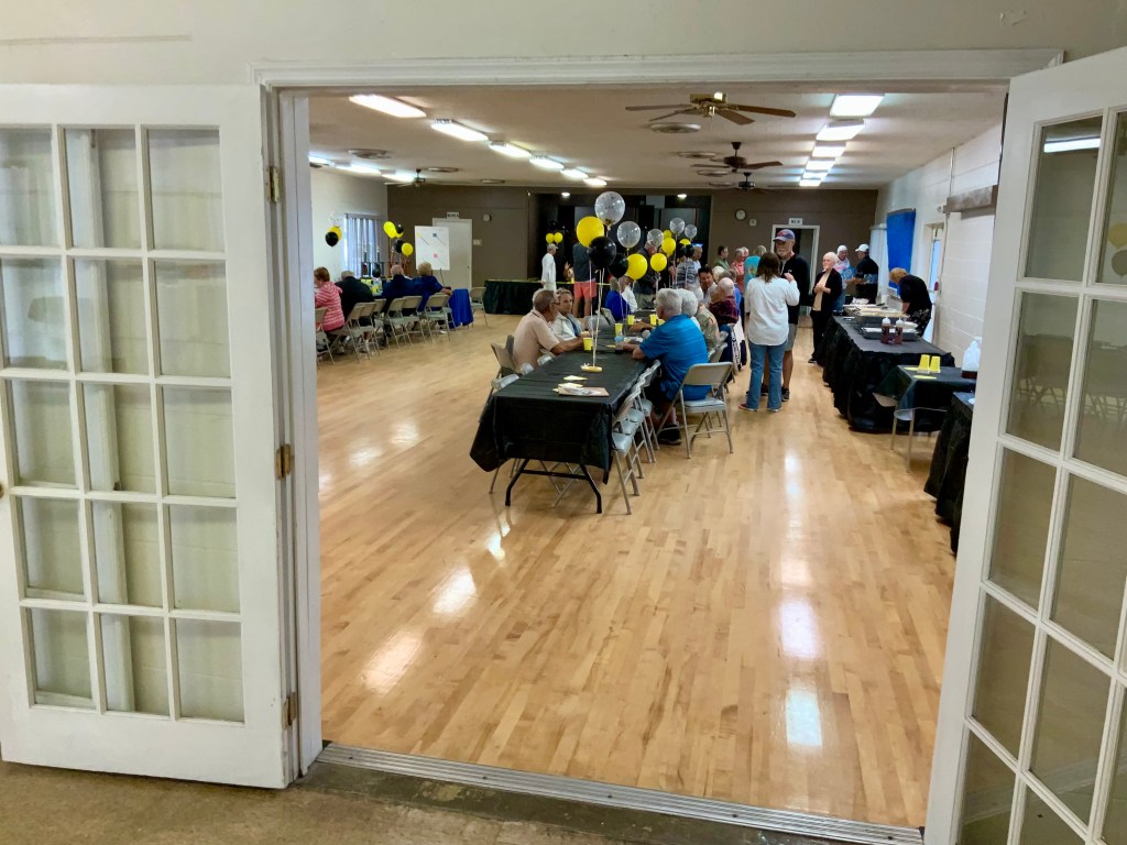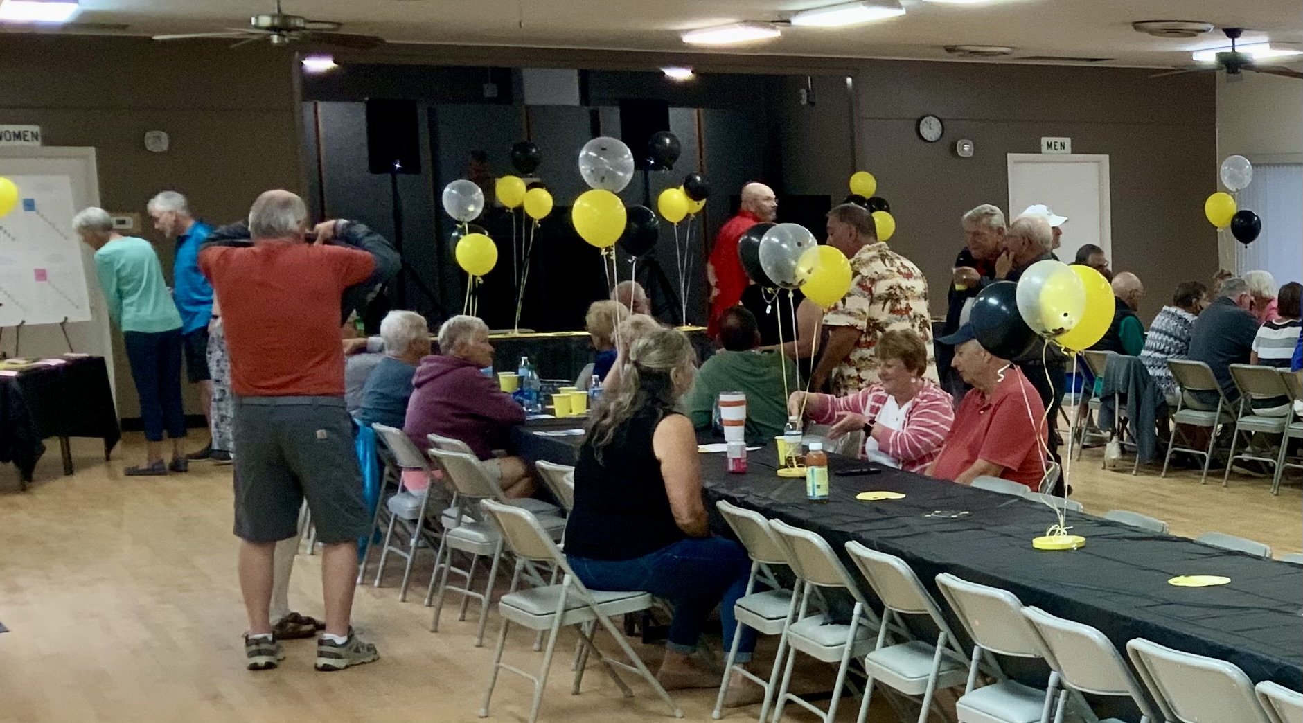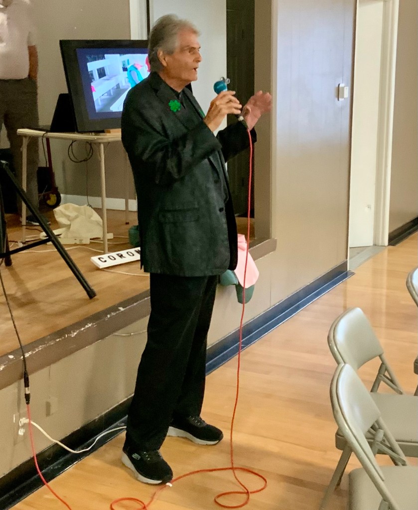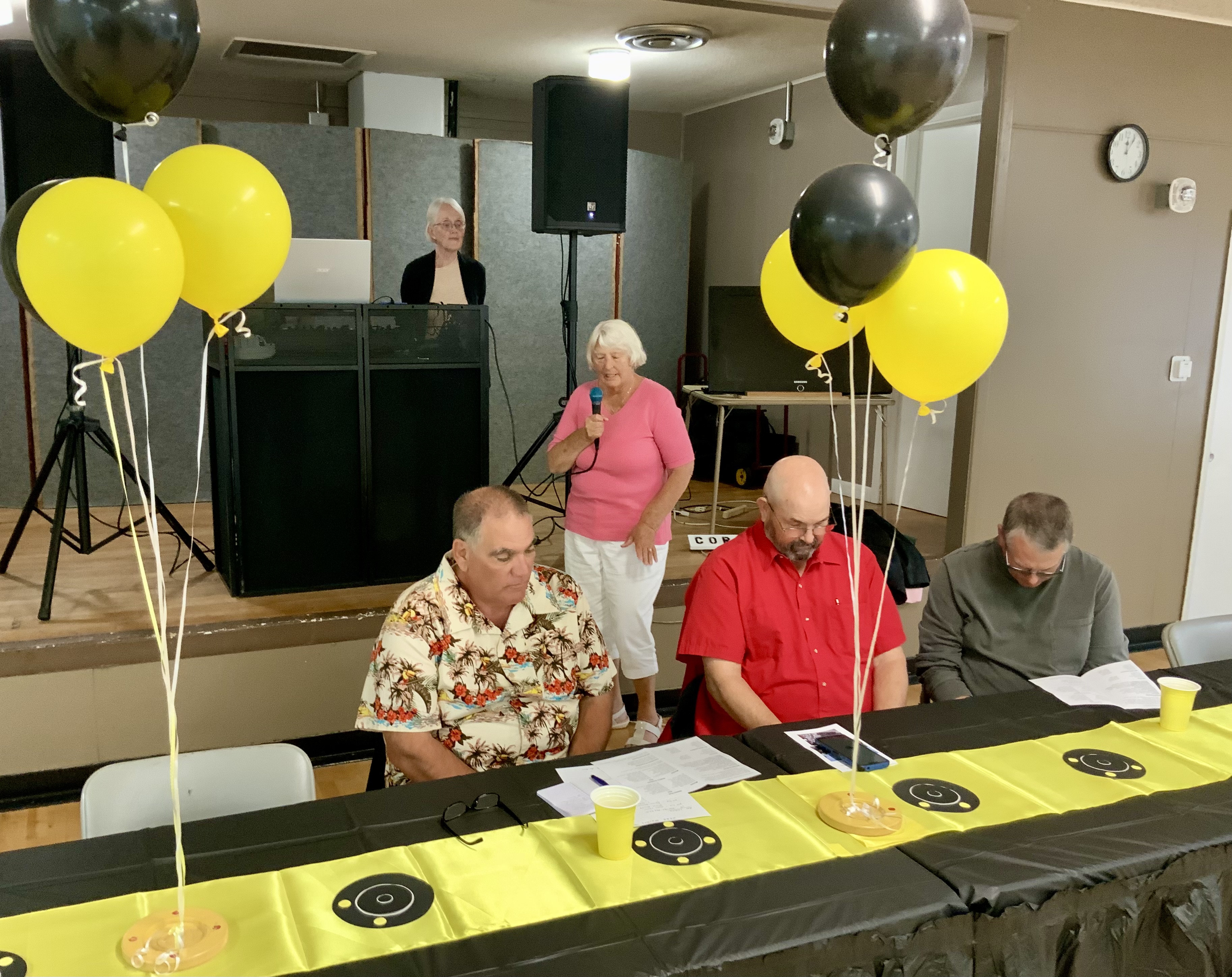 People were having their pictures taken with goofy shuffleboard expression props. Then our Master of Ceremonies and Club Crooner, Stan Williamson, took over the microphone and presented memento trophies to Bob Tager and Zak Wonson as well as a photo of an actual compilation representing 65 total points in one frame. He also entertained us and serenaded Gail Howell with songs from Tom Jones and “The Soul Train”. Everyone had a great time. Thanks to all who made it possible.