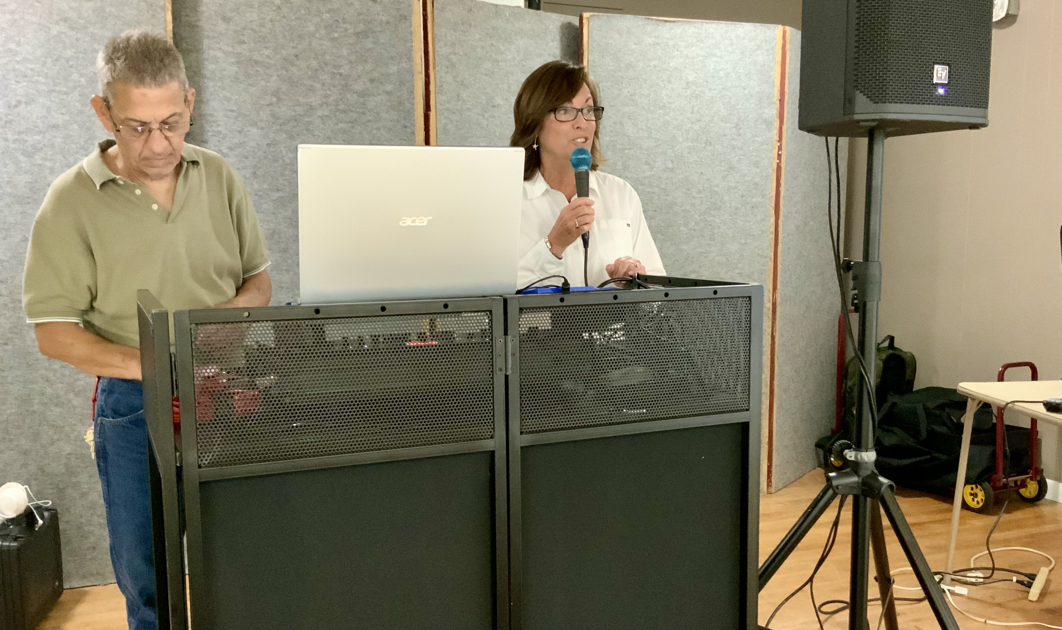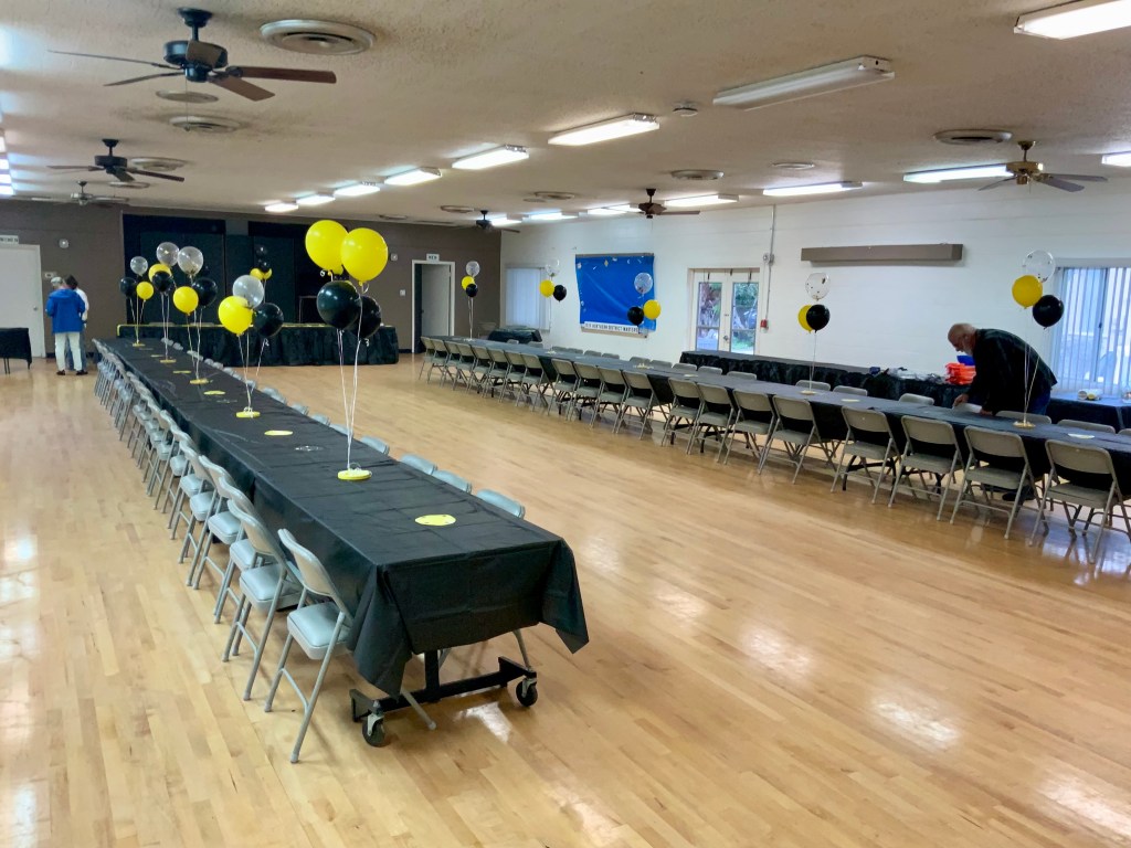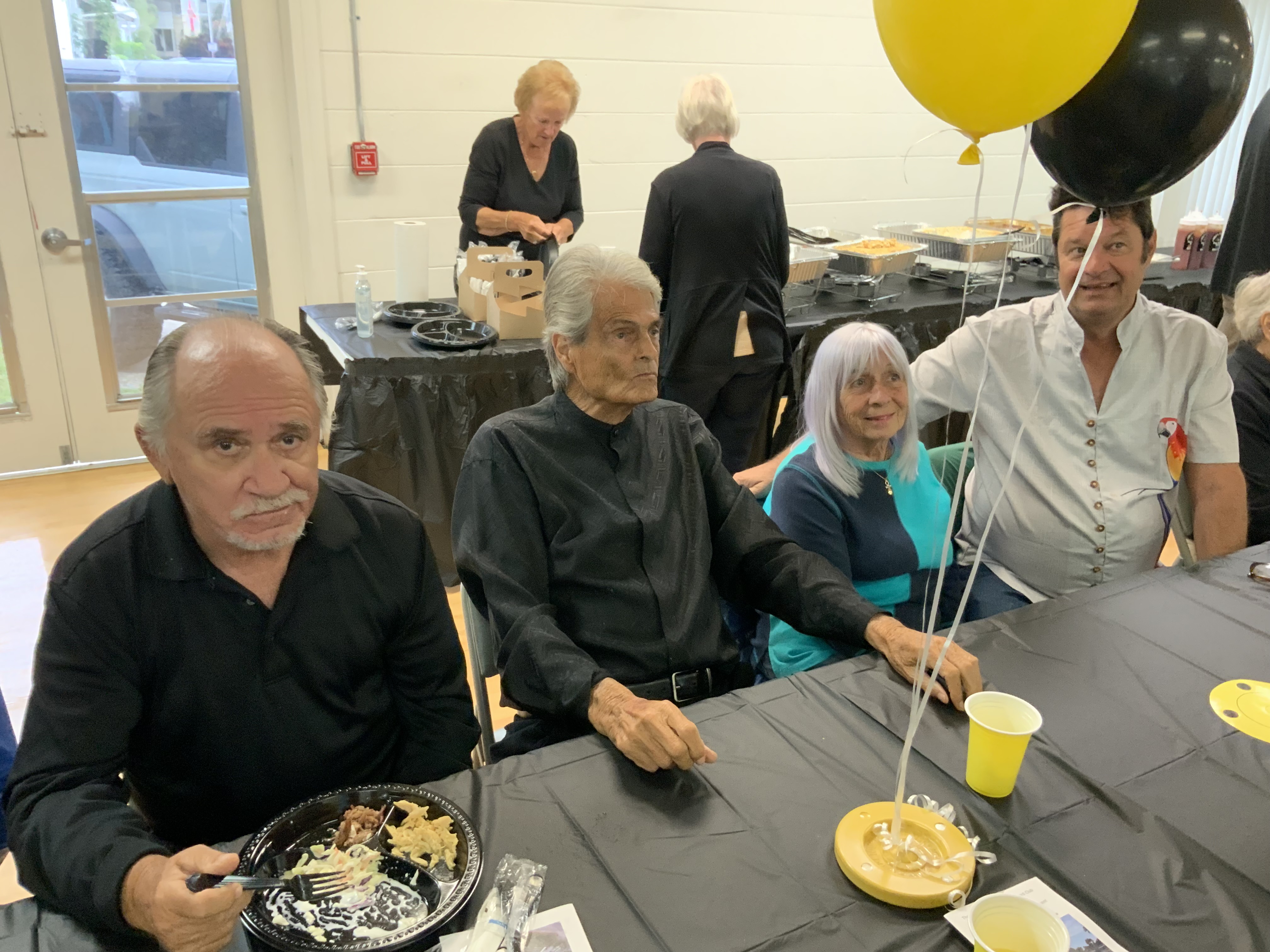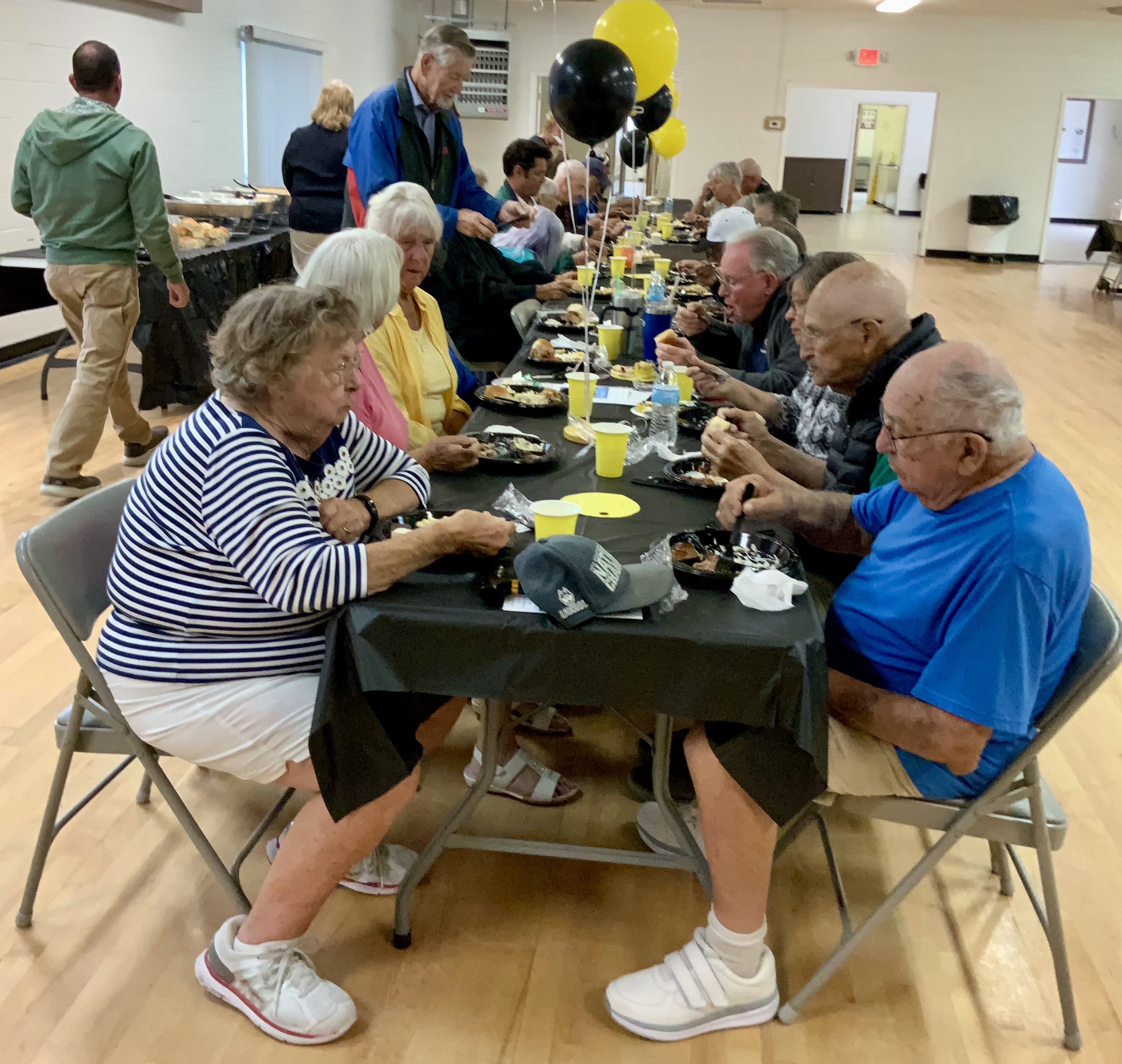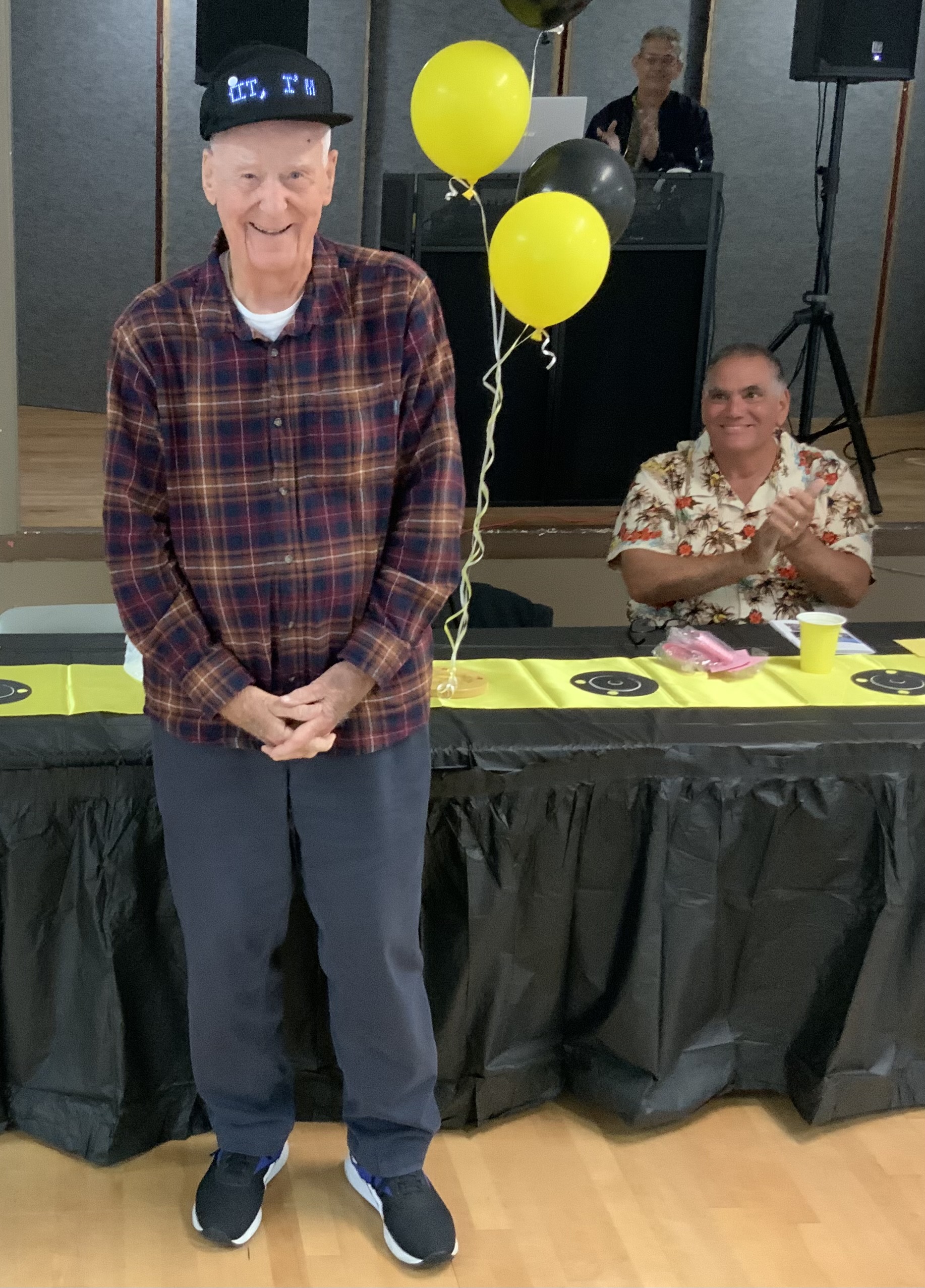 People were having their pictures taken with goofy shuffleboard expression props. Then our Master of Ceremonies and Club Crooner, Stan Williamson, took over the microphone and presented memento trophies to Bob Tager and Zak Wonson as well as a photo of an actual compilation representing 65 total points in one frame. He also entertained us and serenaded Gail Howell with songs from Tom Jones and “The Soul Train”. Everyone had a great time. Thanks to all who made it possible.