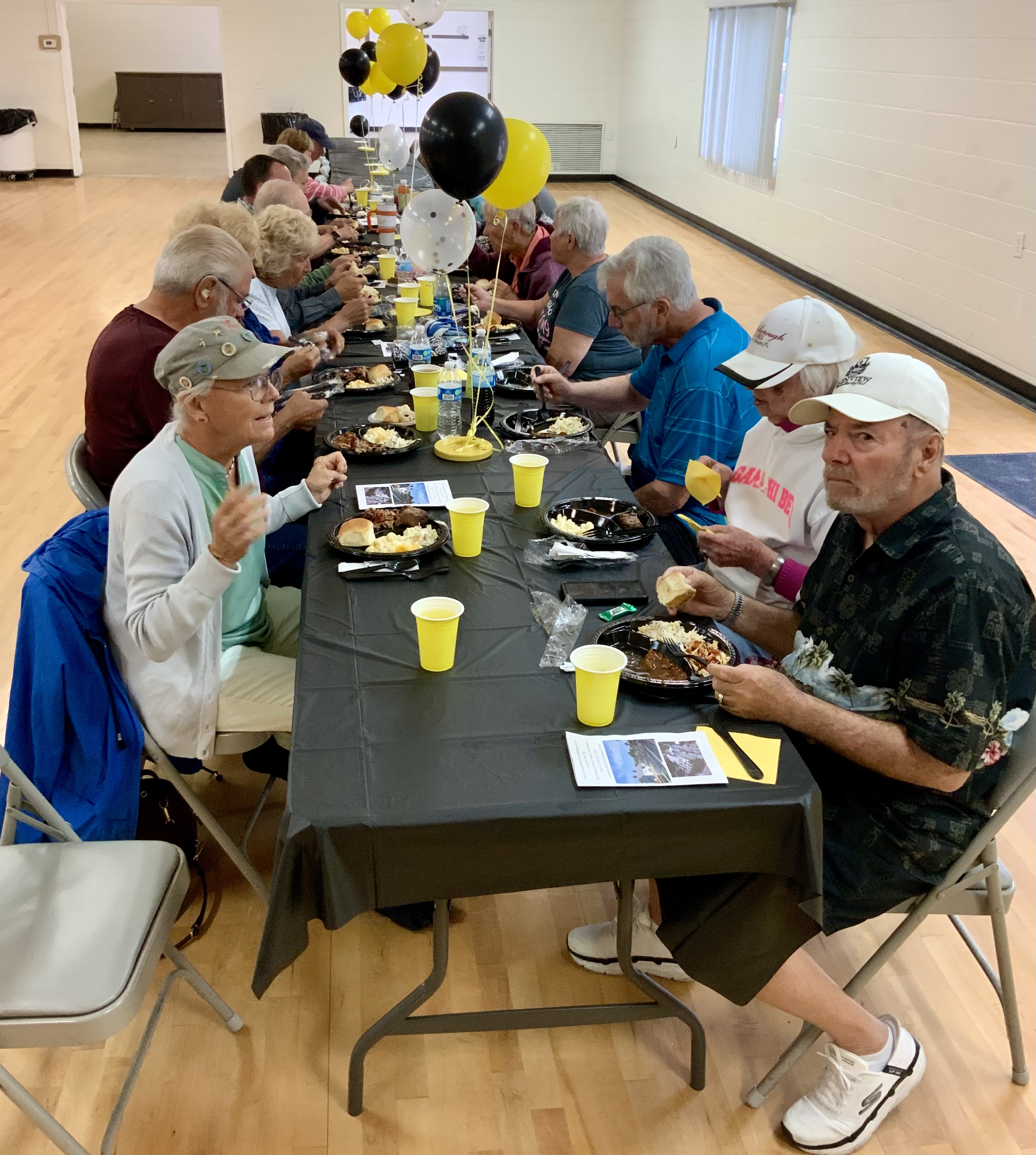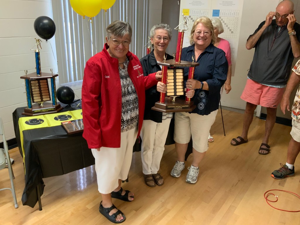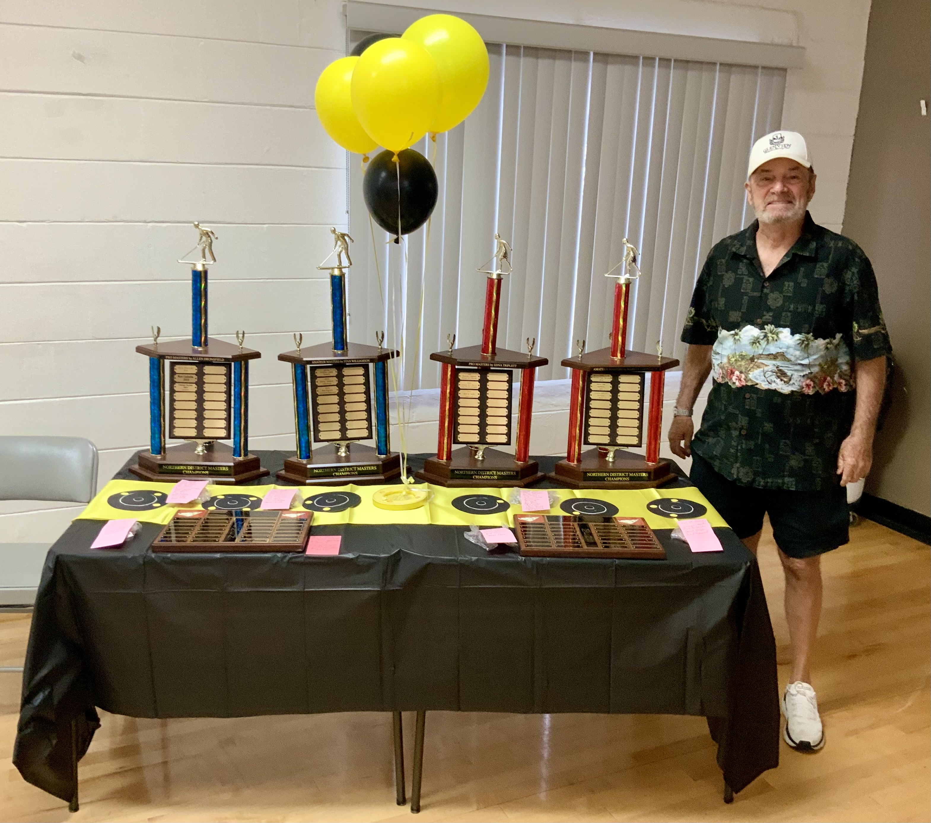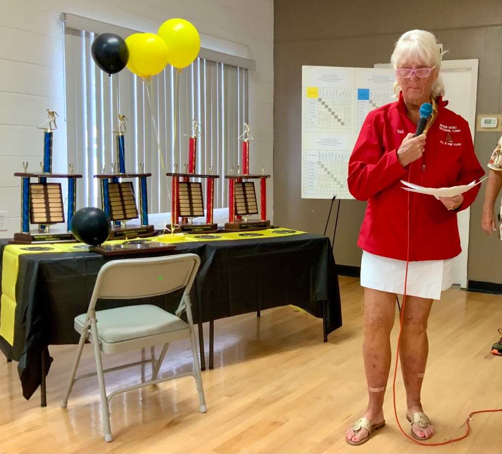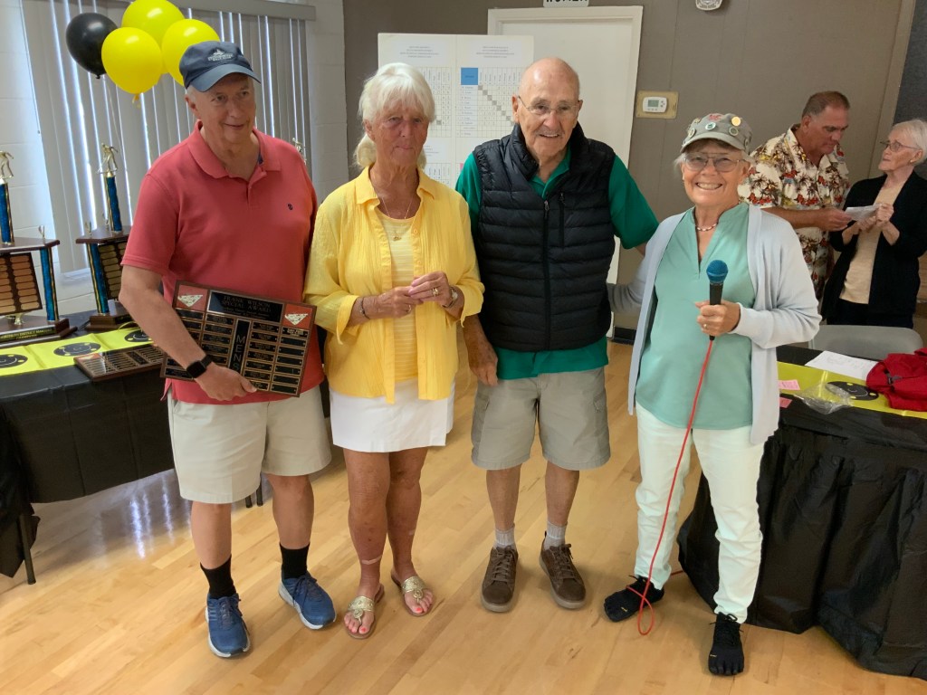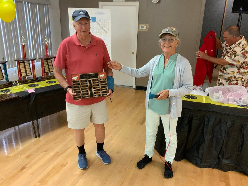Due to the second day of the Masters Tournament being cancelled by rain, we had everyone arrive at 11:00 AM for our Awards Banquet. Janet Shira and her team of Volunteers (Arlene Jabaut, Pat Llodra, Jan and Bill Sweet, Tom Grubb and Mark Gephart) did a fantastic job setting up all the tables and decorating the room. Stan Williamson hired DJ/MC Music/Cruisin Central Florida to entertain us with background music. Cindy did a great job with the summary board showing all of the shuffler’s scores in the tournament. The Awards table was set up with the four Master’s Trophies and the Tournament of Champions (TOC) Frank Wilson Special Award Plaques for the winner of the Amateur Ladies and Amateur Men’s division. Colt’s Pig Stand catered our event with barbeque pork, chicken, mac and cheese along with coleslaw and rolls. Fantastic deserts (so yummy) were supplied by our members. Tim Pergrem set up a TV with a slide show of shuffler events and winners. Photos were supplied by Randy Radke.