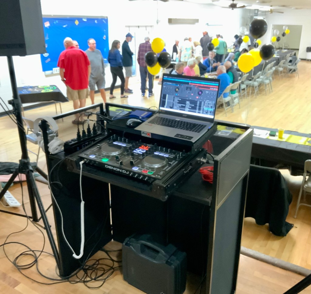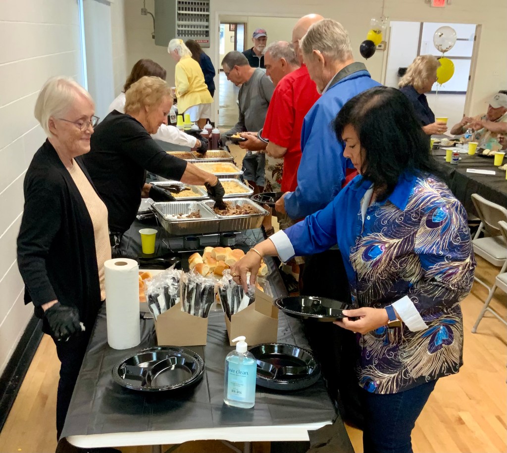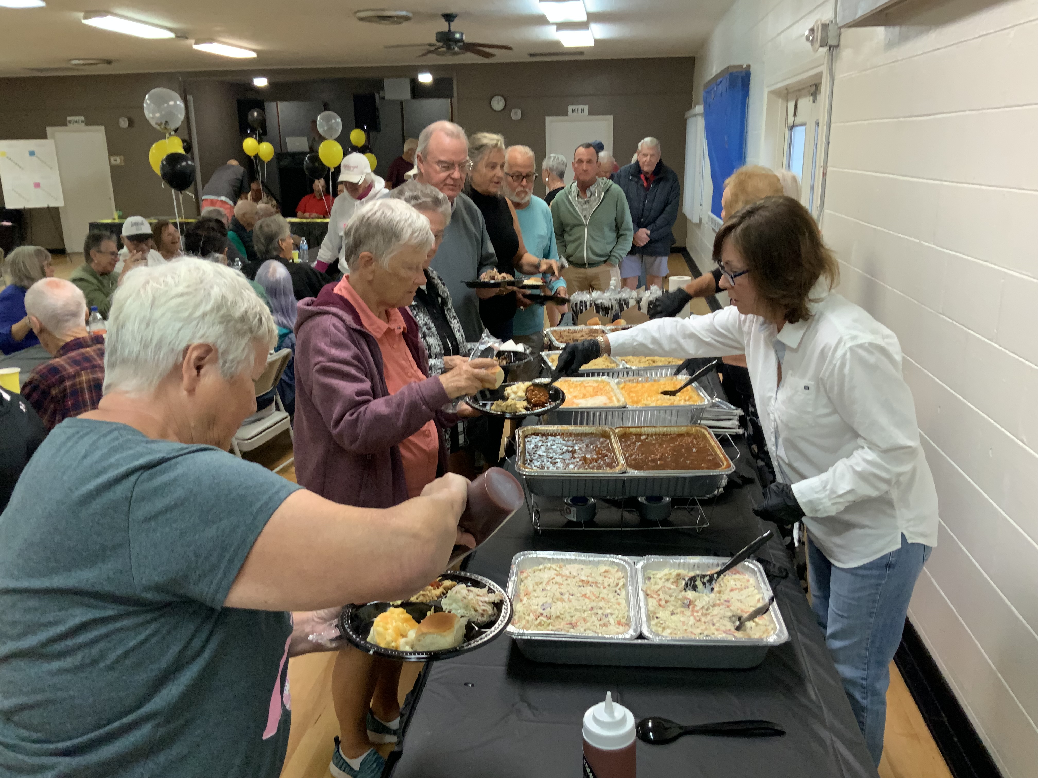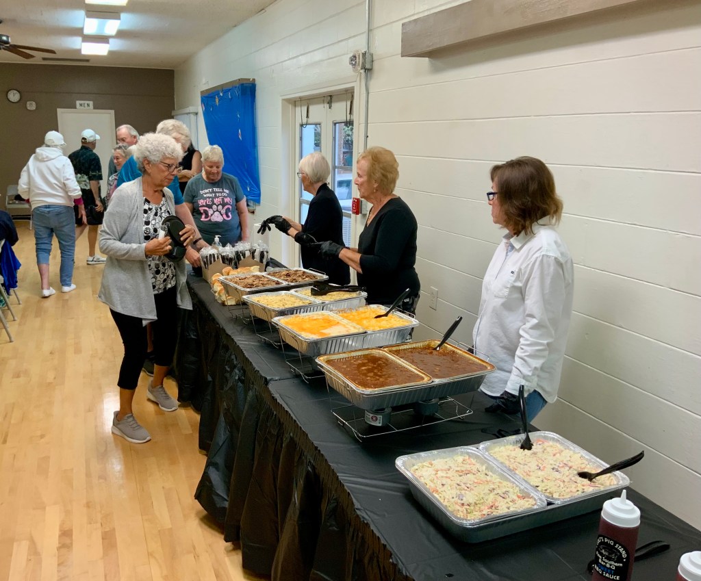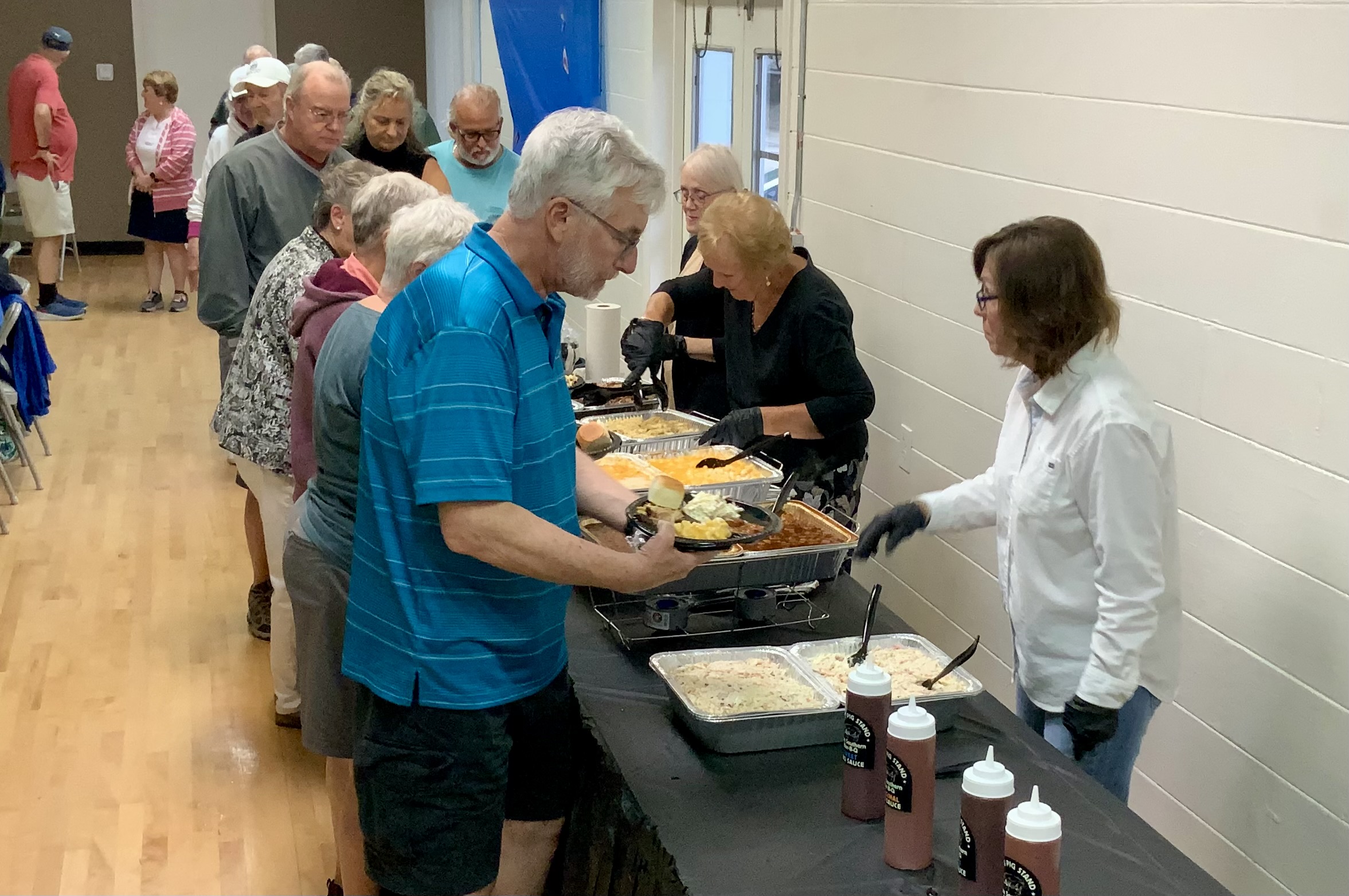 Due to the second day of the Masters Tournament being cancelled by rain, we had everyone arrive at 11:00 AM for our Awards Banquet. Janet Shira and her team of Volunteers (Arlene Jabaut, Pat Llodra, Jan and Bill Sweet, Tom Grubb and Mark Gephart) did a fantastic job setting up all the tables and decorating the room. Stan Williamson hired DJ/MC Music/Cruisin Central Florida to entertain us with background music. Cindy did a great job with the summary board showing all of the shuffler’s scores in the tournament. The Awards table was set up with the four Master’s Trophies and the Tournament of Champions (TOC) Frank Wilson Special Award Plaques for the winner of the Amateur Ladies and Amateur Men’s division. Colt’s Pig Stand catered our event with barbeque pork, chicken, mac and cheese along with coleslaw and rolls. Fantastic deserts (so yummy) were supplied by our members. Tim Pergrem set up a TV with a slide show of shuffler events and winners. Photos were supplied by Randy Radke.