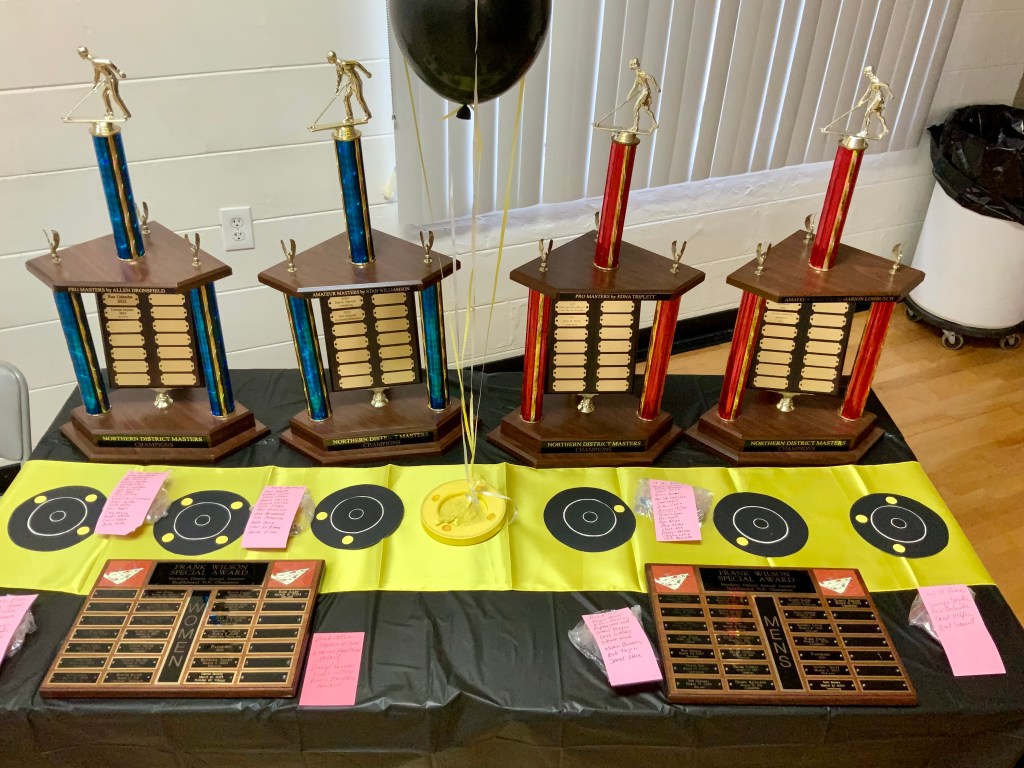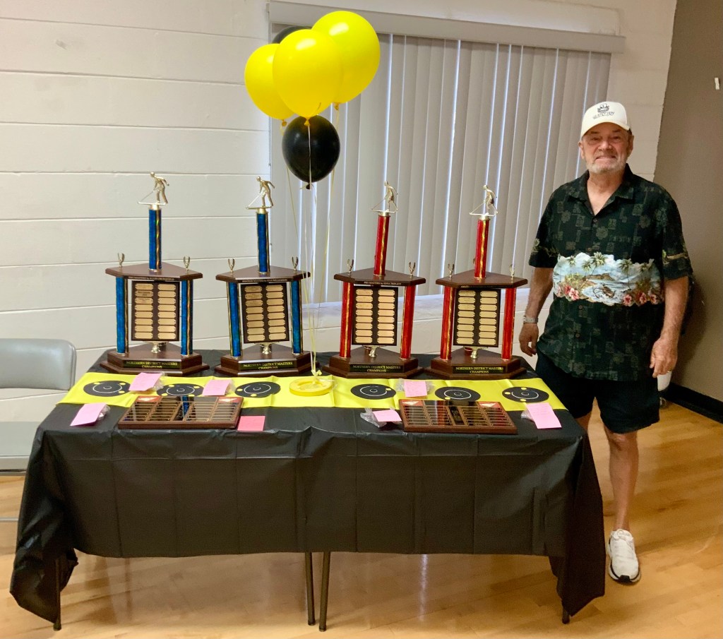 Joe began presenting the pins to each of the appropriate groups that had worked so hard to earn them. 12 Amateurs moved up to State Amateur and 9 State Amateurs moved up to Pro. He also presented each group of players from the Masters Tournament with their Masters Pins. Bonnie Radke presented the pins and awards for winners of the Tournament of Champions. The Frank Wilson Special Awards were given to the Men’s winning Amateur (Darryl Kenyon) and Ladies winning Amateur (Barb Allen). Pins for the winning Pro Ladies Division (Gail Howell) and Pro Men’s Division (John Giumarra) were also given out.