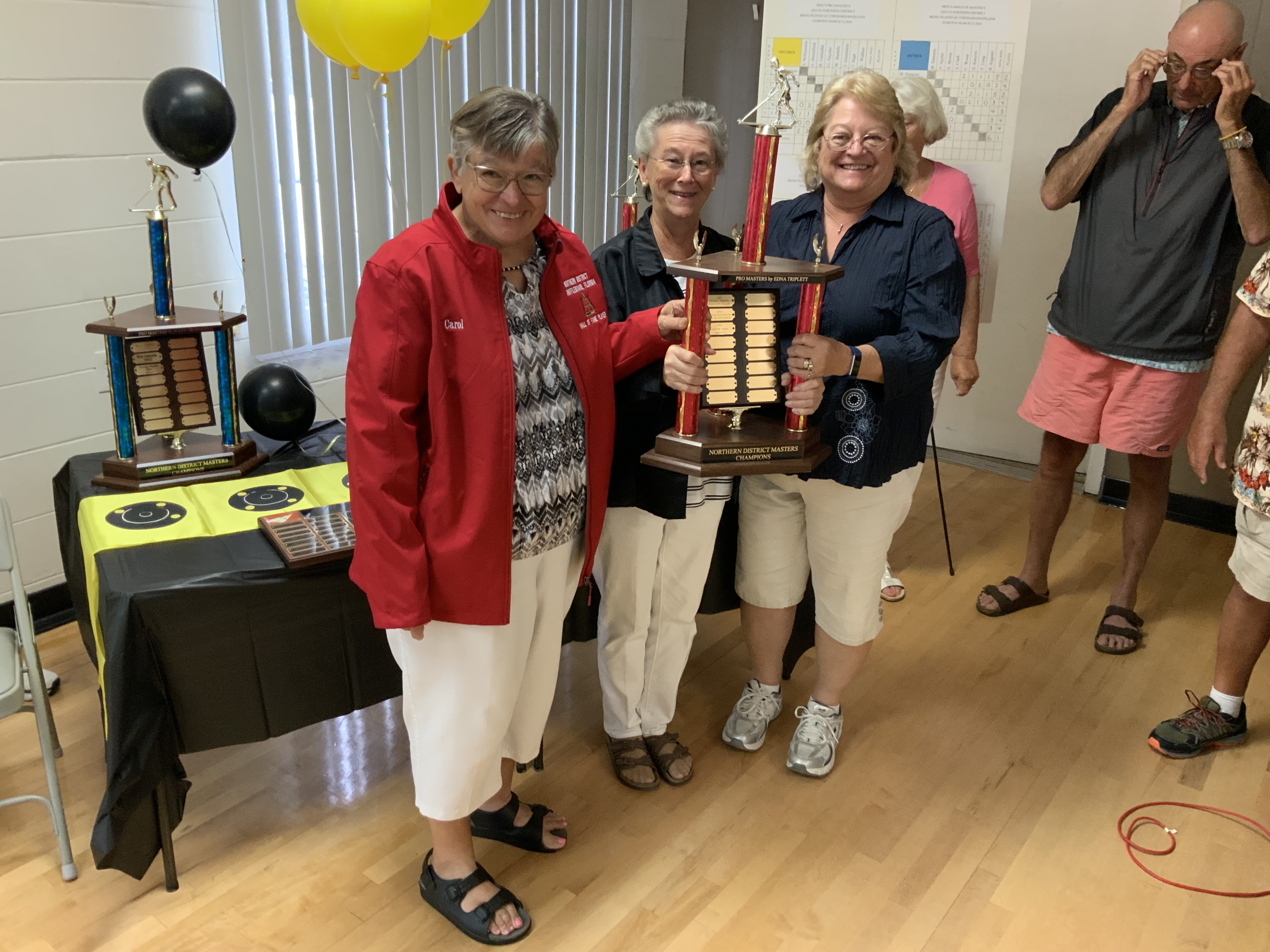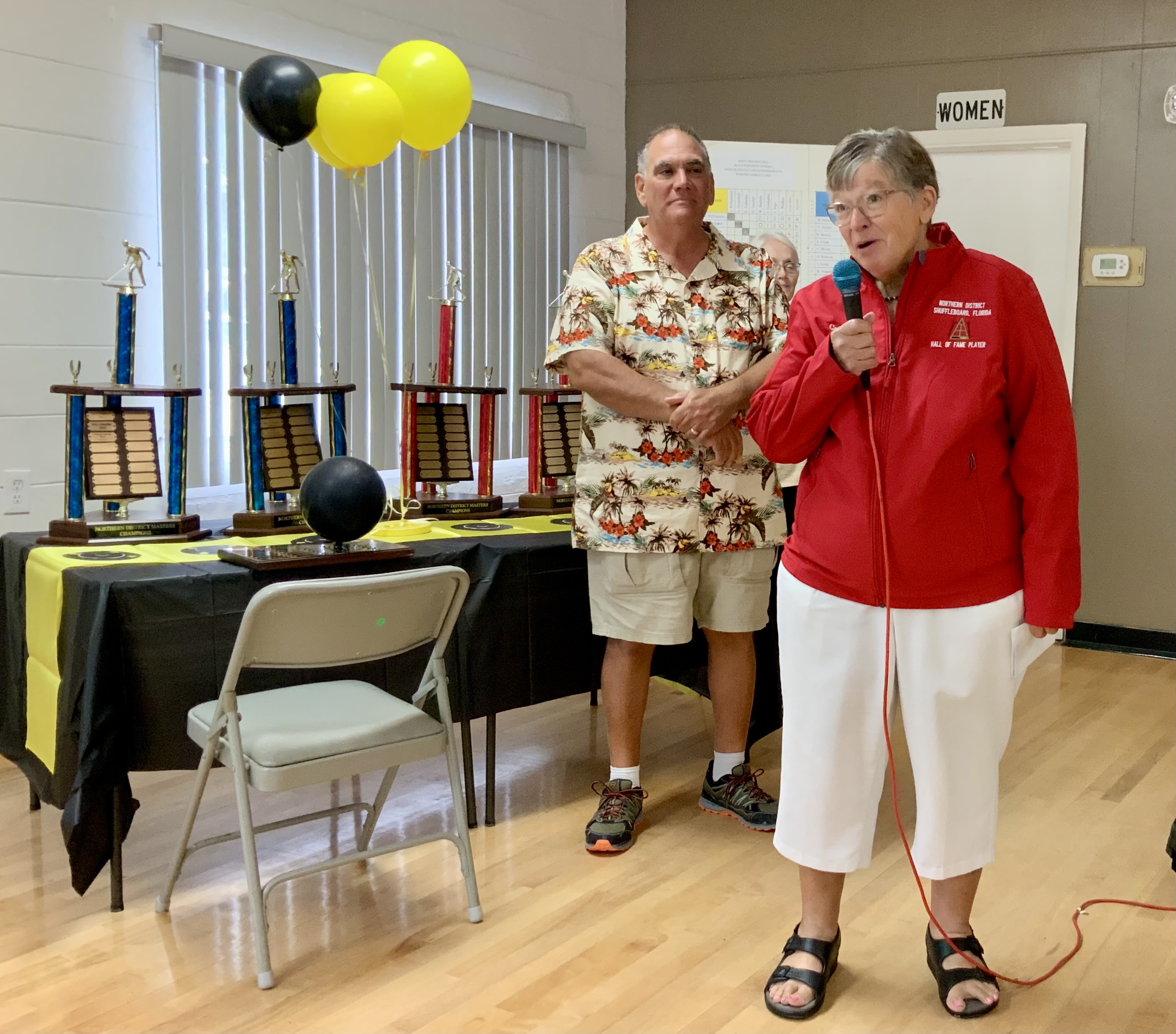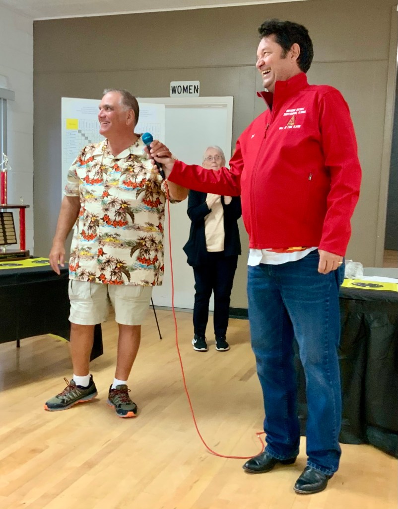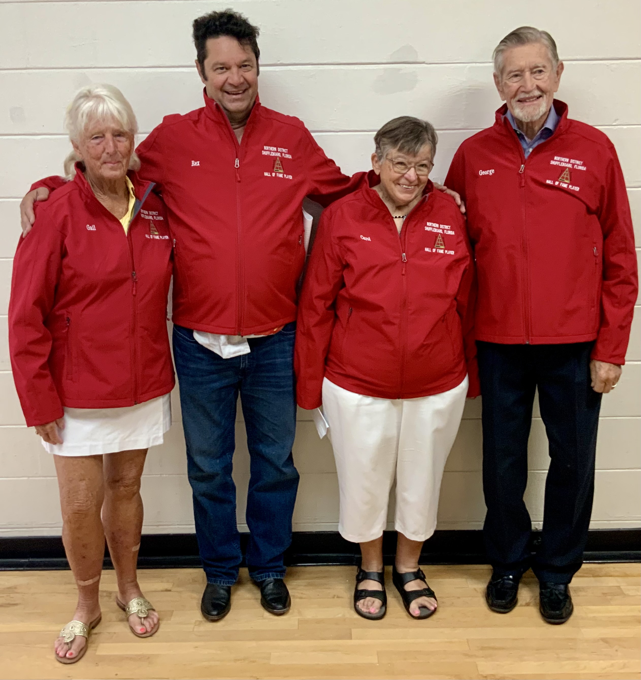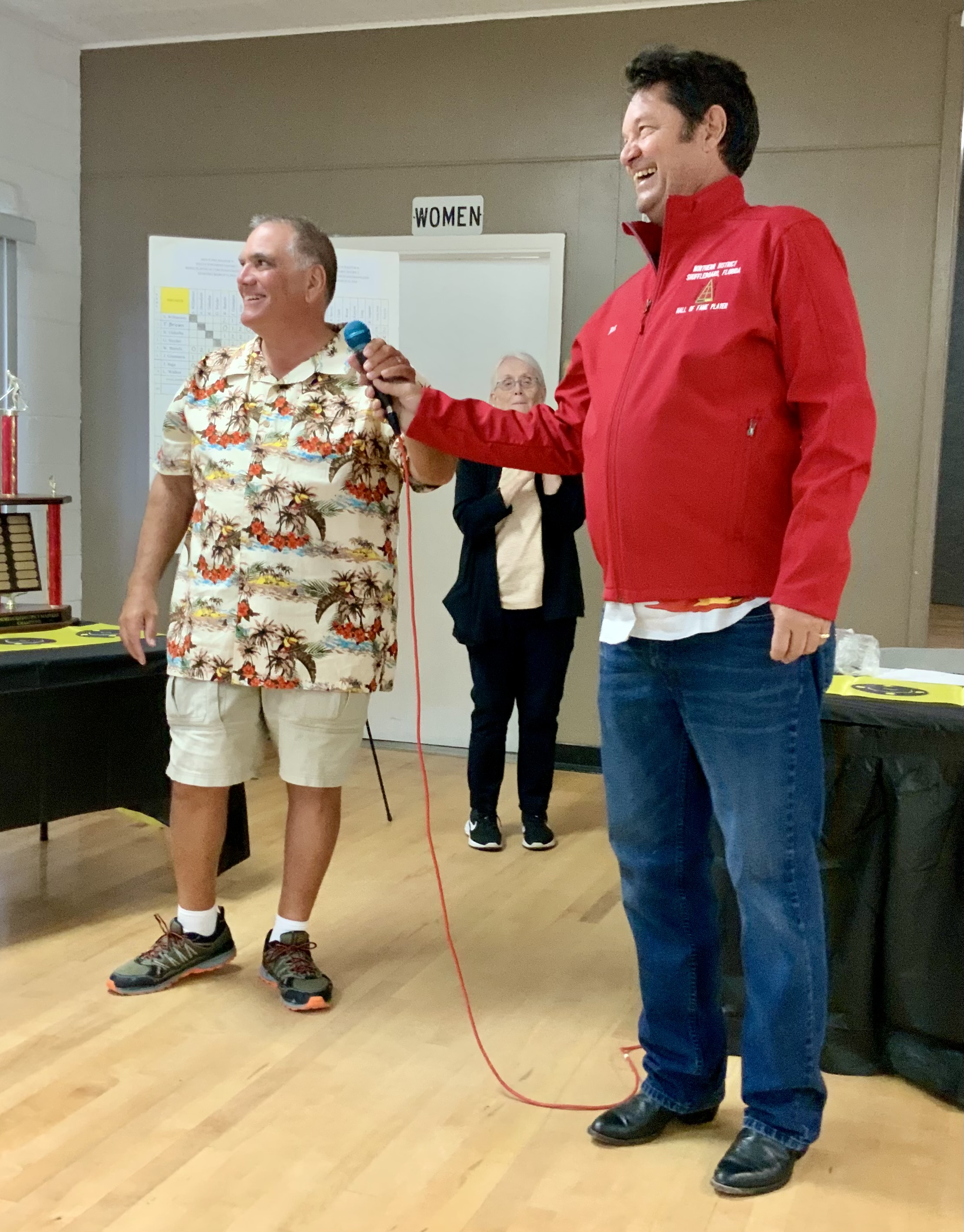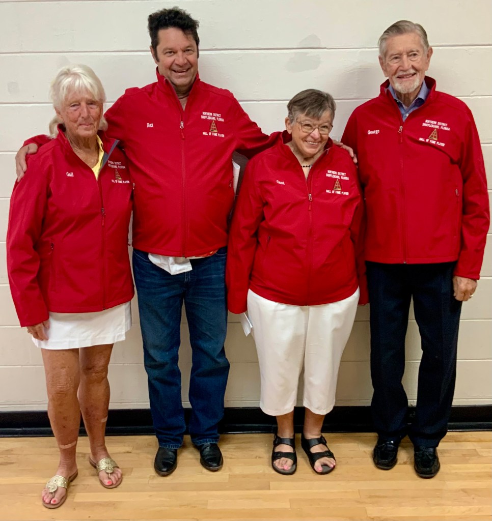 Next came our Hall of Fame (HOF) inductees. They had to earn a total of 200 points over their total tournament shuffleboard experience to be inducted. They were each presented with the HOF pins and a beautiful Red HOF Jacket.