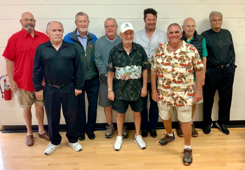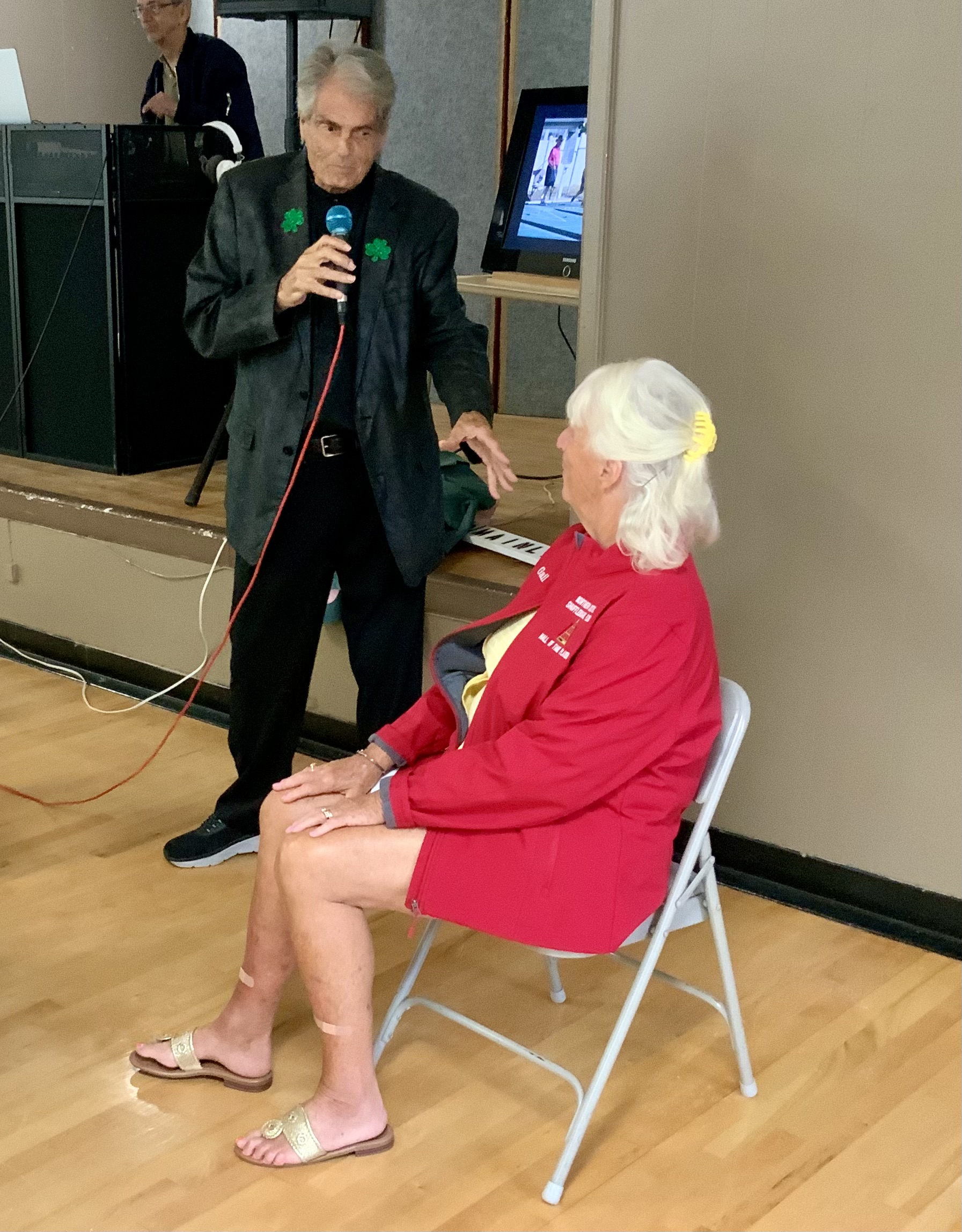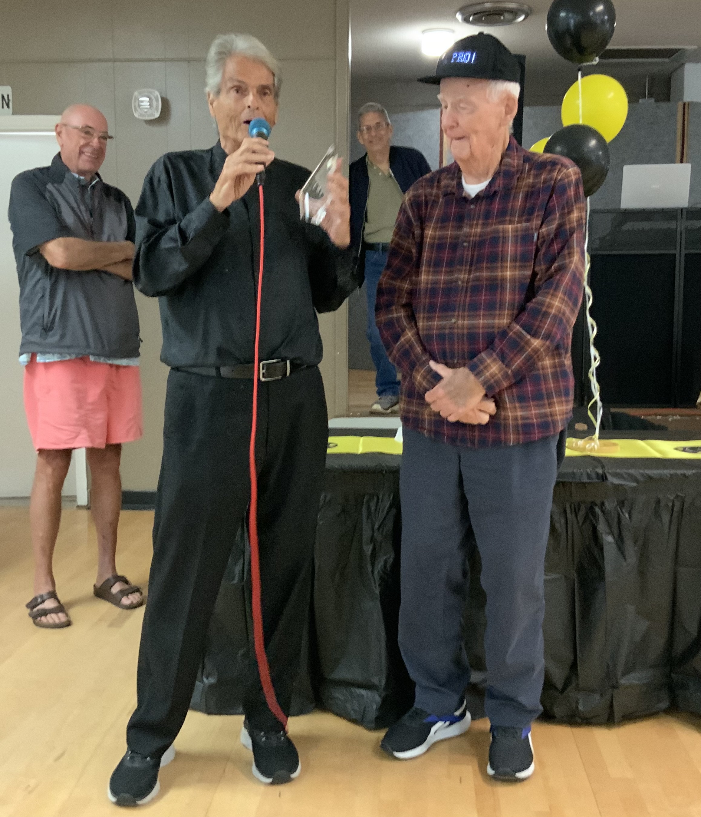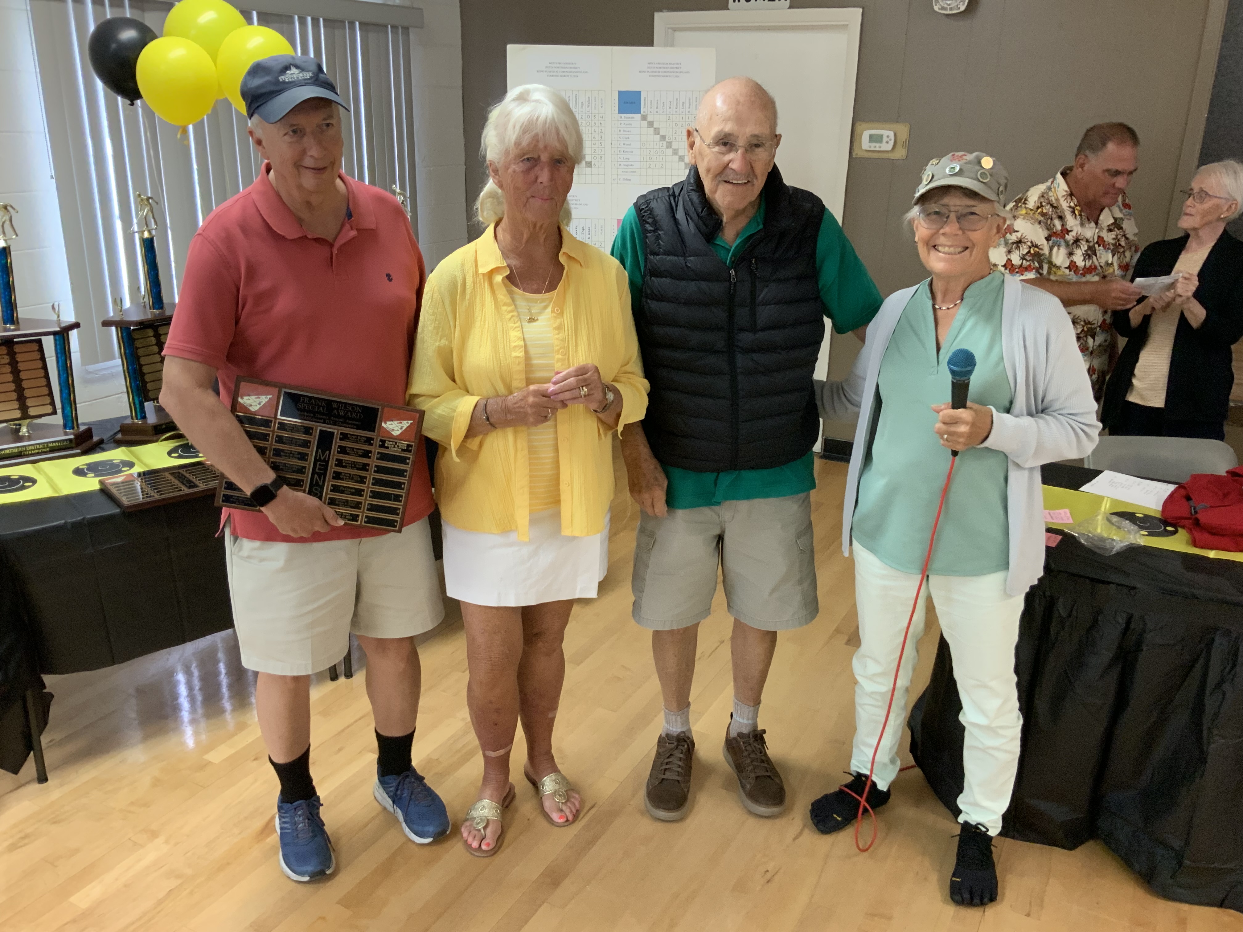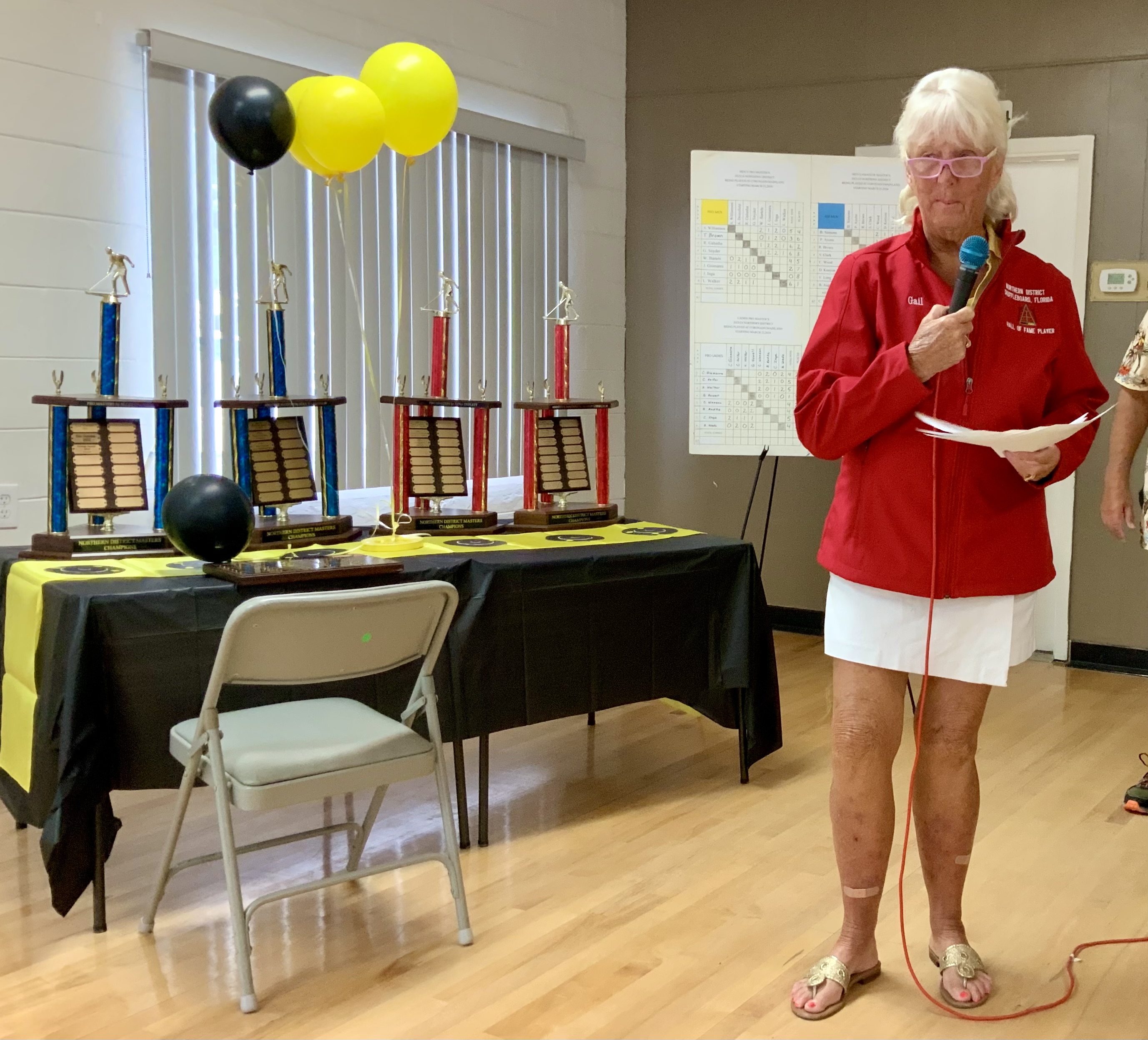 Next came our Hall of Fame (HOF) inductees. They had to earn a total of 200 points over their total tournament shuffleboard experience to be inducted. They were each presented with the HOF pins and a beautiful Red HOF Jacket.