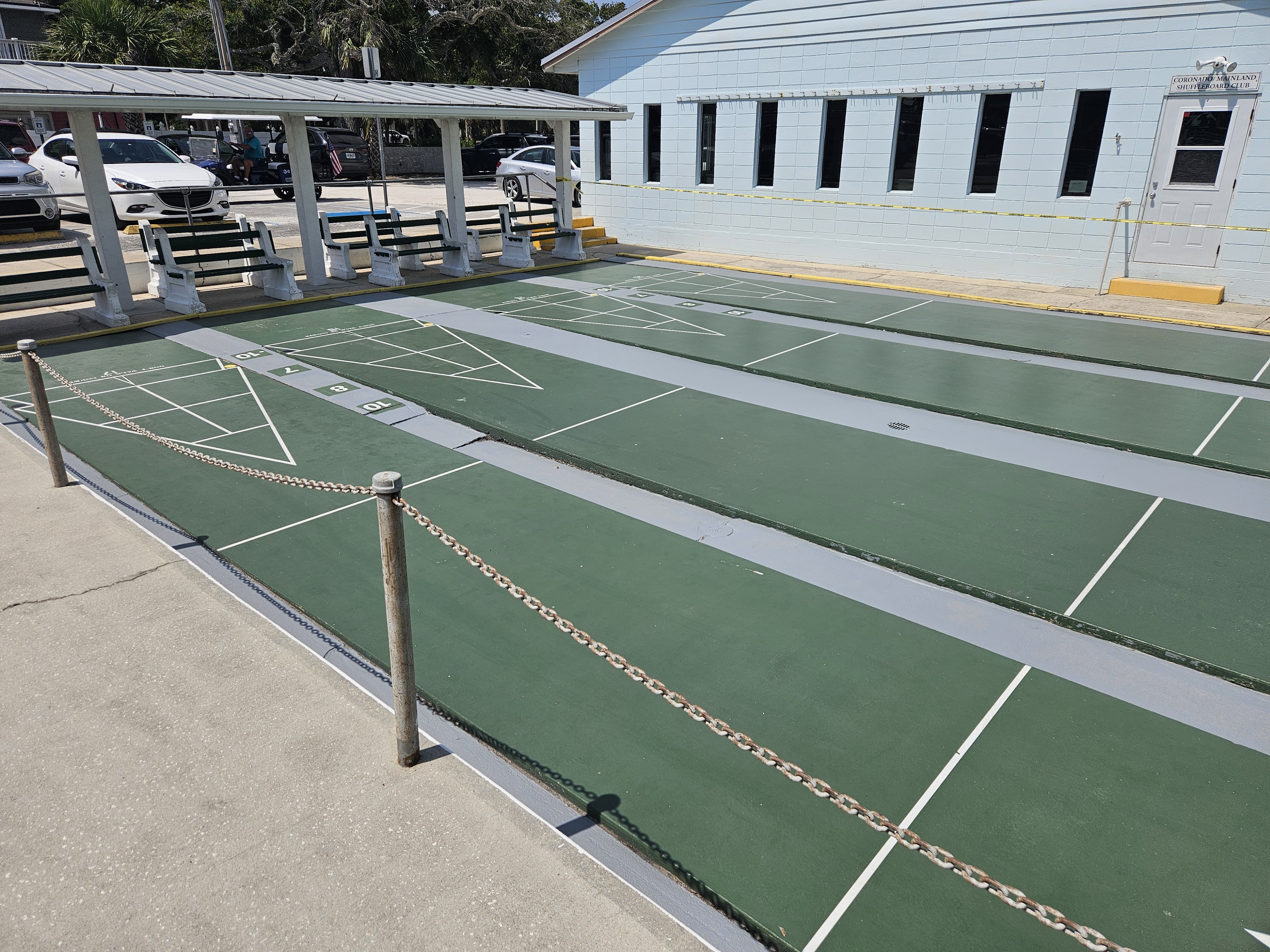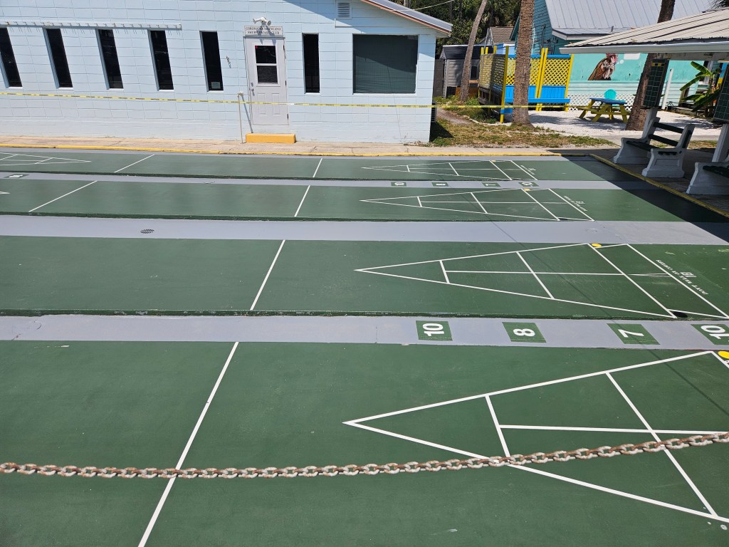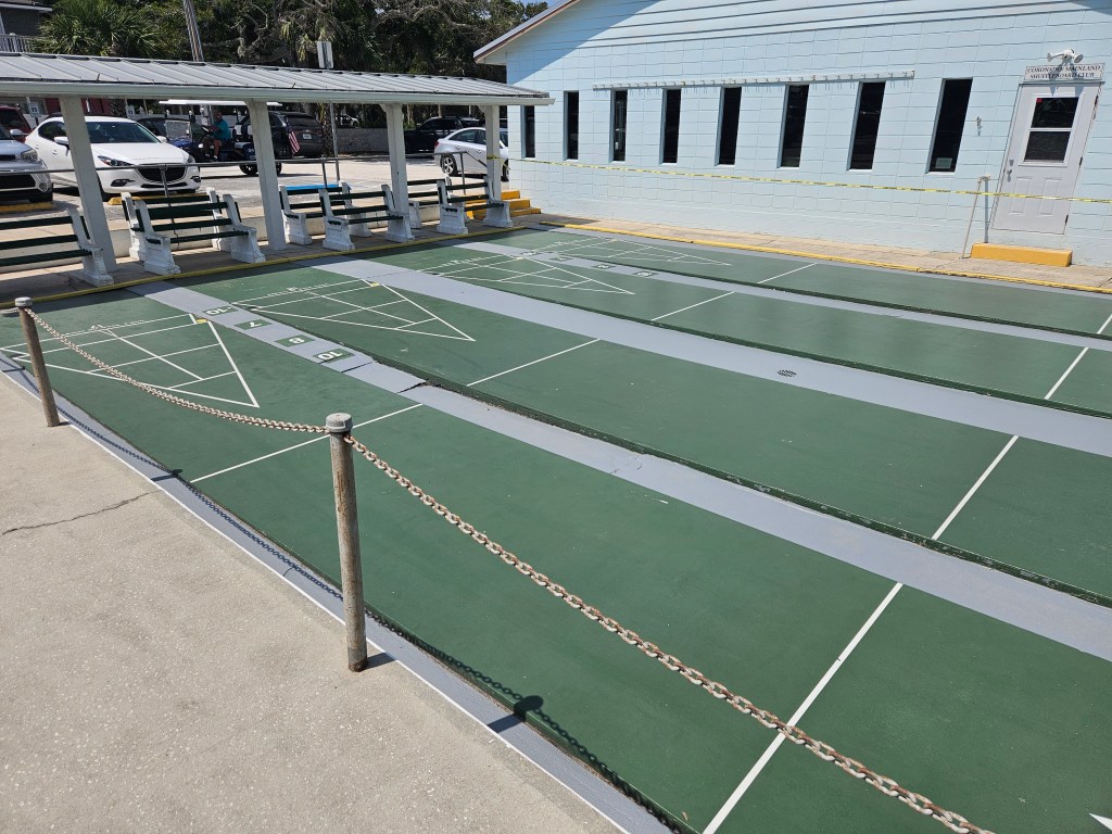 Mike Beall and Zak Wonson started painting the alleys to our courts on Tuesday. They are a little lighter grey than Deland did theirs. The alleys will match our new benches very nicely. They did courts 17 – 20 on Tuesday and Mike, Tim Pergrem, Bob Augusto and Zak are going to do courts 1-4 on Thursday. They will start up top next week. So hot they may only get another four done this week. Thanks guys, the work looks great so far.