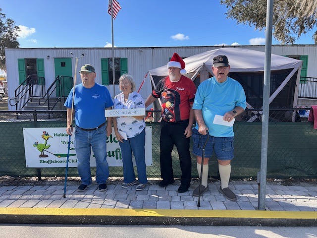 The Holiday RVVillage Shuffleboard Club hosted the ND12 Any Amateur Draw tournament on Dec 17,18, 2024. Gloria Boring was the Director and Clean as a Whistle Car Wash, Bruce and Suzanne Bishop and Gloria Boring were their sponsors. Congratulations to all the shufflers.