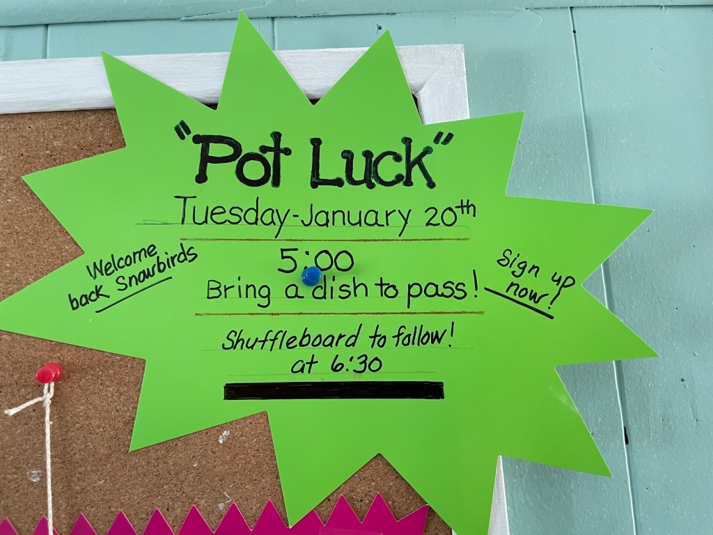 We are excited to announce our first Pot Luck of the season to welcome all our snow birds back on January 20th at 5:00 pm. There is a sign up sheet in the club house to list who is coming and what food you should bring to share. Remember to bring your cups, plates and silverware for the dinner. We will provide coffee and tea as well as a donated turkey and ham. As always if you wish to BYO you are more than welcome to do so.