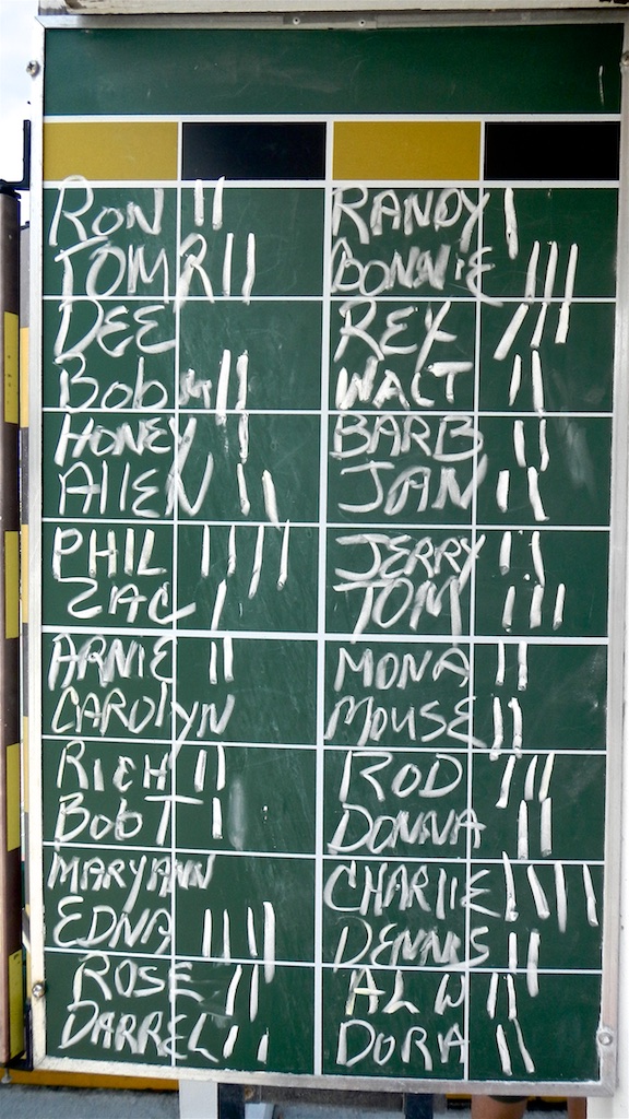 When the teams had completed playing all 20 courts, we all convened to the club house for more socializing and munching while Bonnie Radke totaled the score sheets and verified their accuracy. Then Allen began to announce the winners and hand out the winnings.