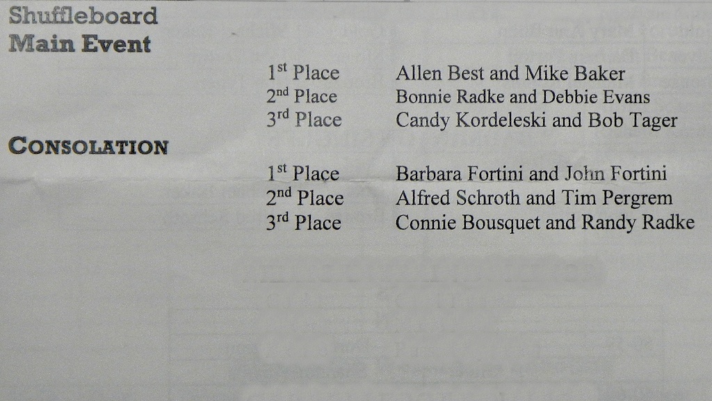 Consolation: First Place – Stan Williamson and Bob Robinson; Second Place – Walt Vilk and Pete Peterson; Third Place – Sharon Upson and Doris Hanke: Fourth Place – Gary Deso and Arnie Fischback.