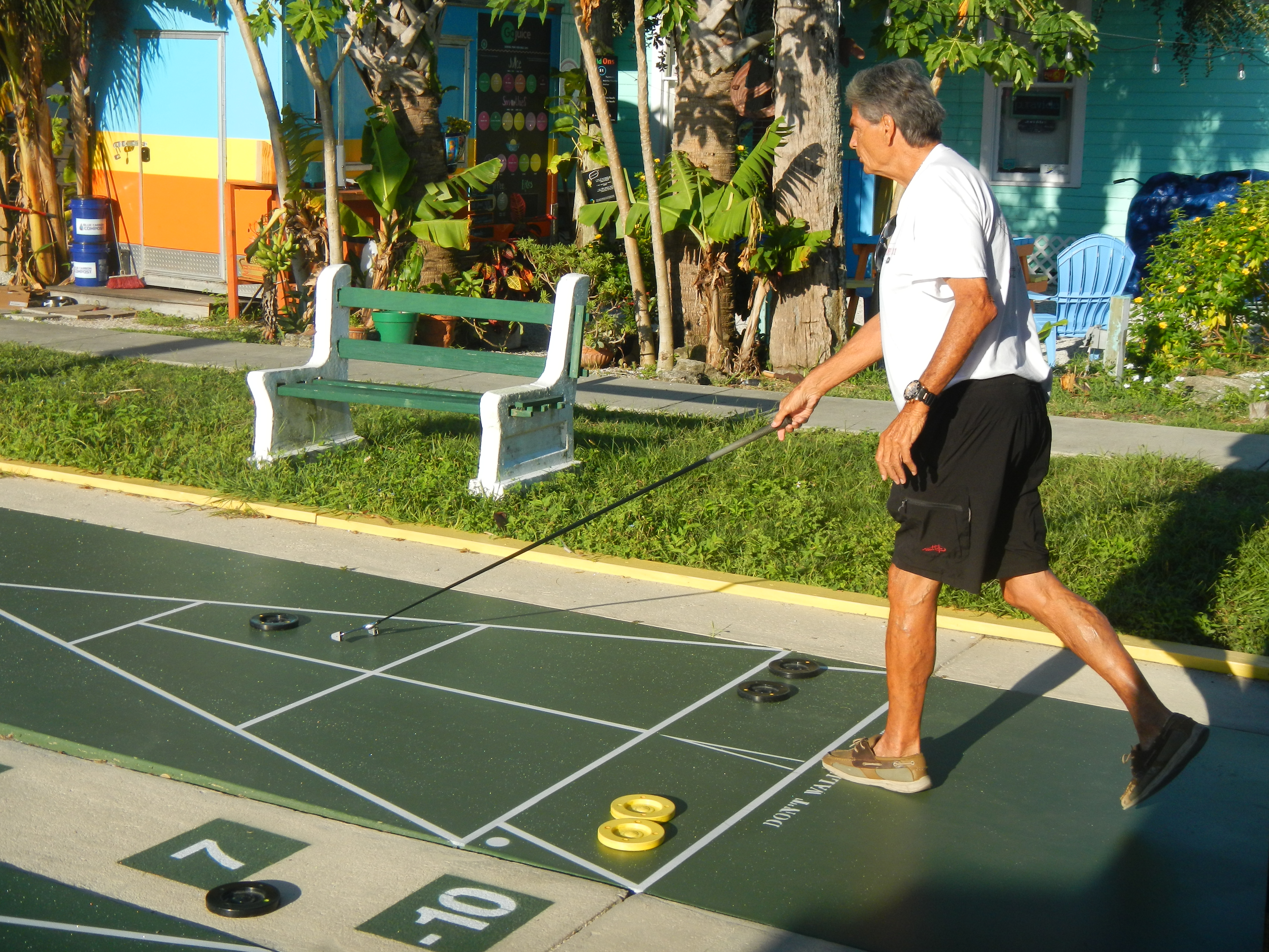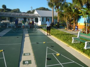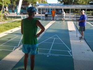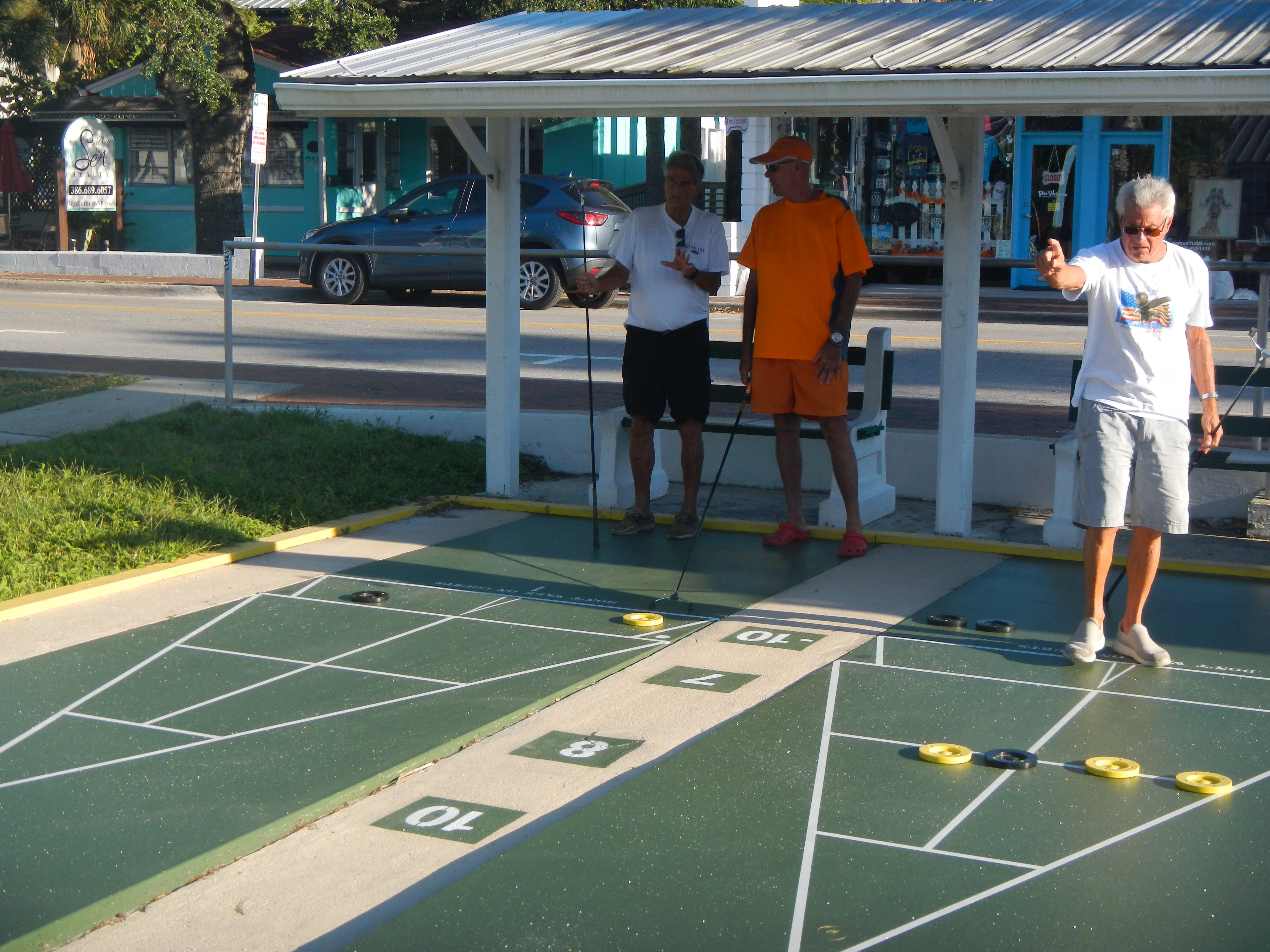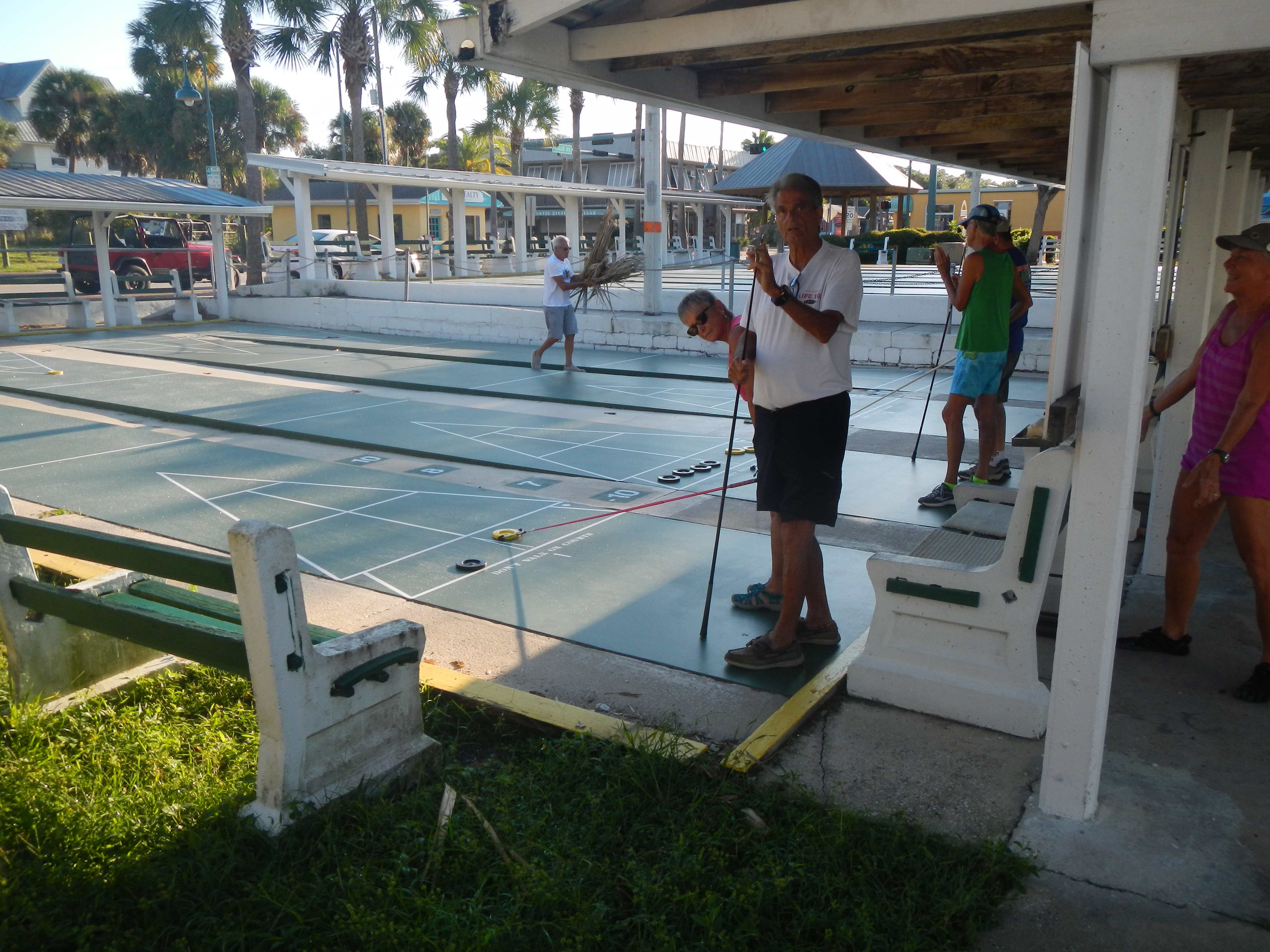 The usual clean up crew arrived to clean and set up the courts for the Thursday Morning Four Play Challenge. Sixteen (16) enthusiastic shufflers showed up to meet the challenge and prepare for the upcoming tournament season starting Oct. 3rd in Deland. Randall and Rita Harman stopped by the courts to say hello to everyone and thank us all for our good words and prayers for Darrel Harman. Congratulations to Debbie Evans and Randy Radke for winning all four of their matches. We have only two more weeks left this season to play the Thursday Morning Challenge, so come on down. Ciao!